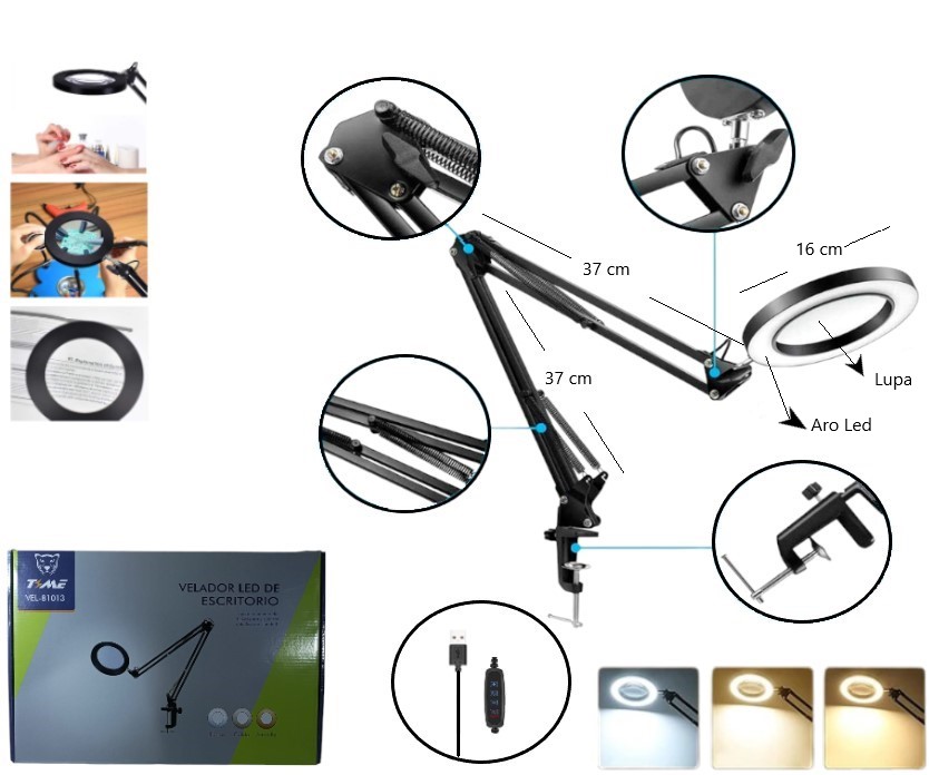 VELADOR LED RETRACTIL ARTICULADA CON LUPA 3 TONOS
